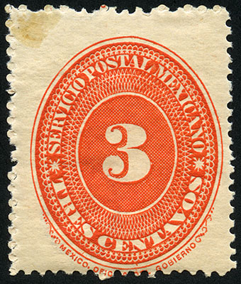 Para más información favor de dirigirse a biblioteca@mufi.org.mx No. Scott: 222 -- Año de Emisión: 1892 -- Valor facial: Tres Centavos -- Variedad de color: Naranja -- Dentado:12 -- Tipo de impresión: Grabado Timbre Postal Mexicano en color naranja, en él se observa el número tres, el cual se encuentra centrado en un óvalo ornamentado, alrededor del mismo está escrito "SERVICIO POSTAL MEXICANO" y el valor facial de "TRES CENTAVOS".