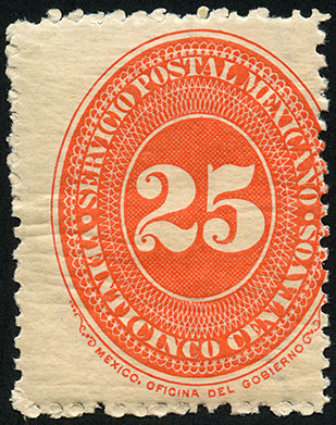 Para más información favor de dirigirse a biblioteca@mufi.org.mx No. Scott: 227 -- Año de Emisión: 1892 -- Valor facial: Veinticinco Centavos -- Variedad de color: Naranja -- Dentado:12 -- Tipo de impresión: Grabado Timbre Postal Mexicano en color naranja, en él se observa el número veinticinco, el cual se encuentra centrado en un óvalo ornamentado, alrededor del mismo está escrito "SERVICIO POSTAL MEXICANO" y el valor facial de "VEINTICINCO CENTAVOS".