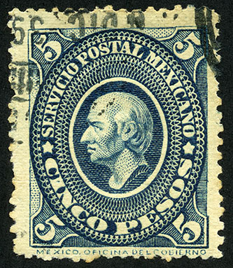 Para más información favor de dirigirse a biblioteca@mufi.org.mx No. Scott: 230-- Año de Emisión: 1892 -- Valor facial: Cinco Pesos -- Variedad de color: Azul Verde -- Dentado:12 -- Tipo de impresión: Grabado Timbre Postal Mexicano en color azul verde, en él se observa la imagen de Miguel Hidalgo y Costilla, la cual se centra en un óvalo ornamentado, alrededor del mismo está escrito "SERVICIO POSTAL MEXICANO" y "CINCO PESOS", así también aparece en cada esquina el valor facial con número.