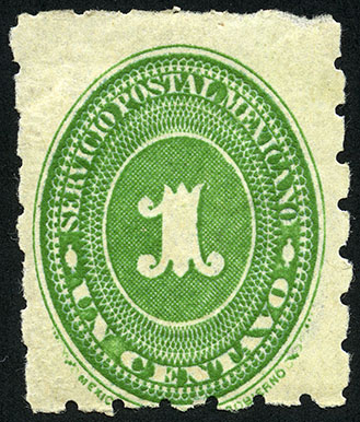 Para más información favor de dirigirse a biblioteca@mufi.org.mx No. Scott: 232-- Año de Emisión: 1894 -- Valor facial: Un Centavo -- Variedad de color: Verde -- Dentado: 5 1/2, 6 -- Tipo de impresión: Grabado Timbre Postal Mexicano en color verde, en él se observa el número uno, el cual se encuentra centrado en un óvalo ornamentado, alrededor del mismo está escrito "SERVICIO POSTAL MEXICANO" y el valor facial de "UN CENTAVO".