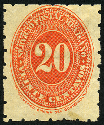 Para más información favor de dirigirse a biblioteca@mufi.org.mx No. Scott: 236A -- Año de Emisión: 1894 -- Valor facial: Veinte Centavos -- Variedad de color: Bermellón -- Dentado: 5 1/2, 6 -- Tipo de impresión: Grabado Timbre Postal Mexicano en color bermellón, en él se observa el número veinte, el cual se encuentra centrado en un óvalo ornamentado, alrededor del mismo está escrito "SERVICIO POSTAL MEXICANO" y el valor facial de "VEINTE CENTAVOS".