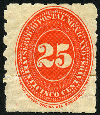 Para más información favor de dirigirse a biblioteca@mufi.org.mx No. Scott: 237 -- Año de Emisión: 1894 -- Valor facial: Veinticinco Centavos -- Variedad de color: Bermellón -- Dentado: 5 1/2, 6 -- Tipo de impresión: Grabado Timbre Postal Mexicano en color bermellón, en él se observa el número veinticinco, el cual se encuentra centrado en un óvalo ornamentado, alrededor del mismo está escrito "SERVICIO POSTAL MEXICANO" y el valor facial de "VEINTICINCO CENTAVOS".