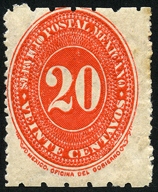 Para más información favor de dirigirse a biblioteca@mufi.org.mx No. Scott: 240A -- Año de Emisión: 1894 -- Valor facial: Veinte Centavos -- Variedad de color: Bermellón -- Dentado: 5 1/2 x 11, 11 x 5 1/2 -- Tipo de impresión: Grabado Timbre Postal Mexicano en color bermellón, en él se observa el número veinte, el cual se encuentra centrado en un óvalo ornamentado, alrededor del mismo está escrito "SERVICIO POSTAL MEXICANO" y el valor facial de "VEINTE CENTAVOS".