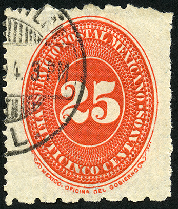 Para más información favor de dirigirse a biblioteca@mufi.org.mx No. Scott: 241 -- Año de Emisión: 1894 -- Valor facial: Veinticinco Centavos -- Variedad de color: Bermellón -- Dentado: 5 1/2 x 11, 11 x 5 1/2 -- Tipo de impresión: Grabado Timbre Postal Mexicano en color bermellón, en él se observa el número veinticinco, el cual se encuentra centrado en un óvalo ornamentado, alrededor del mismo está escrito "SERVICIO POSTAL MEXICANO" y el valor facial de "VEINTICINCO CENTAVOS".