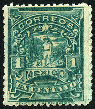 Para más información favor de dirigirse a biblioteca@mufi.org.mx No. Scott: 242 -- Año de Emisión: 1895 -- Valor facial: Un Centavo -- Variedad de color: Verde -- Dentado: 12 -- Tipo de impresión: Grabado Timbre Postal Mexicano en color verde, en el se óbserva un paisaje rodeado de arbustos y a una persona que al parecer es un mensajero, el cual viste ropa de manta y sombrero, en la parte superior aparace la palabra "CORREOS", en la parte inferior "MEXICO" y el valor facial de "UN CENTAVO", del lado izquierdo y derecho se indica el valor con número. Este timbre pertenece a la serie conocida como "Mulitas".