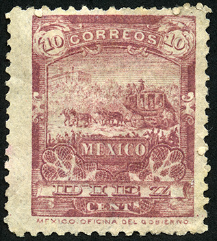 Para más información favor de dirigirse a biblioteca@mufi.org.mx No. Scott: 248 -- Año de Emisión: 1895 -- Valor facial: Diez Centavos -- Variedad de color: Rosa Mate -- Dentado: 12 -- Tipo de impresión: Grabado Timbre Postal Mexicano en color rosa mate, en él se observa un paisaje rodeado de vegetación, en el centro de la imagen hay tres personas sentadas arriba de un carruaje y frente a este cuatro animales, al parecer son mulas o caballos, en la parte superior aparece el valor facial con número y la palabra "CORREOS", en la parte inferior "MEXICO " y "DIEZ CENTAVOS". Este timbre pertenece a la serie conocida como "Mulitas"
