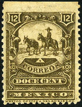 Para más información favor de dirigirse a biblioteca@mufi.org.mx No. Scott: 249 -- Año de Emisión: 1895 -- Valor facial: Doce Centavos -- Variedad de color: Café Olivo -- Dentado: 12 -- Tipo de impresión: Grabado Timbre Postal Mexicano en color café olivo, en el se observa un paisaje desértico, dos animales que al parecer son mulas o caballos, uno de ellos lleva un cargamento y en el otro va montado una persona quien lleva puesto un sombrero, en la parte superior aparece el valor facial con número y en la parte inferior aparecen las palabras "CORREOS", "DOCE CENTAVOS" y "MEXICO". Este timbre pertenece a la serie conocida como "Mulitas".