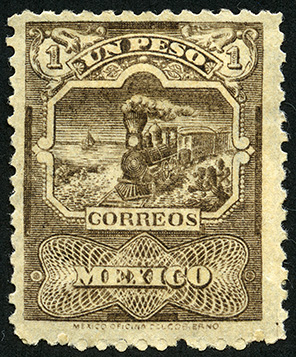 Para más información favor de dirigirse a biblioteca@mufi.org.mx No. Scott: 254 -- Año de Emisión: 1895 -- Valor facial: Un Peso -- Variedad de color: Café Oscuro -- Dentado: 12 -- Tipo de impresión: Grabado Timbre Postal Mexicano en color café oscuro, en él se observa un paisaje con características diferentes, en la parte central aparece un tren aparentemente en movimiento, del lado derecho al parecer es una zona desértica, identificándose en el extremo inferior un captus y del lado izquierdo pudiera haber un río apareciendo en mi opinión un barco, en la parte superior aparece el valor facial de "UN PESO" con número y letra y en la parte inferior las palabras "CORREOS" y "MEXICO". Este timbre pertenece a la serie conocida como "Mulitas".
