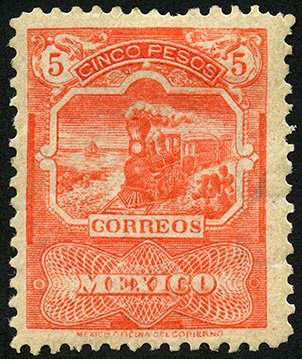 Para más información favor de dirigirse a biblioteca@mufi.org.mxNo. Scott: 255 -- Año de Emisión: 1895 -- Valor facial: Cinco Pesos -- Variedad de color: Naranja Rojizo -- Dentado: 12 -- Tipo de impresión: Grabado