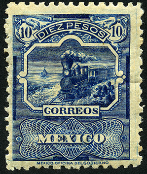 Para más información favor de dirigirse a biblioteca@mufi.org.mx No. Scott: 256 -- Año de Emisión: 1895 -- Valor facial: Diez Pesos -- Variedad de color: Azul Oscuro -- Dentado: 12 -- Tipo de impresión: Grabado Timbre Postal Mexicano en color azul oscuro, en él se observa un paisaje con características diferentes, en la parte central aparece un tren aparentemente en movimiento, del lado derecho al parecer es una zona desértica, identificándose en el extremo inferior un captus y del lado izquierdo pudiera haber un río apareciendo en mi opinión un barco, en la parte superior aparece el valor facial de "DIEZ PESOS" con número y letra y en la parte inferior las palabras "CORREOS" y "MEXICO". Este timbre pertenece a la serie conocida como "Mulitas".