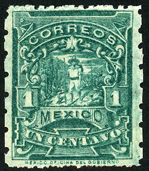 Para más información favor de dirigirse a biblioteca@mufi.org.mx No. Scott: 256h -- Año de Emisión: 1895 -- Valor facial: Un Centavo -- Variedad de color: Verde -- Dentado: 12 -- Tipo de impresión: Grabado Timbre Postal Mexicano en color verde, en el se observa un paisaje rodeado de arbustos y a una persona que al parecer es un mensajero, el cual viste ropa de manta y sombrero, en la parte superior aparace la palabra "CORREOS", en la parte inferior "MEXICO" y el valor facial de "UN CENTAVO", del lado izquierdo y derecho se indica el valor con número. Es importante mencionar que este timbre pertenece a la serie conocida como "Mulitas" y que se puede encontrar información variada entre catálogos filatélicos.