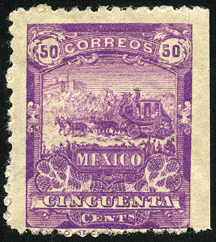Para más información favor de dirigirse a biblioteca@mufi.org.mx No. Scott: 265 -- Año de Emisión: 1896-1897 -- Valor facial: Cincuenta Centavos -- Variedad de color: Violeta -- Dentado: 12,6, 6X12, 12X6 -- Tipo de impresión: Grabado Timbre Postal Mexicano en color violeta, en él se observa un paisaje rodeado de vegetación, en el centro de la imagen hay tres personas sentadas arriba de un carruaje y frente a este cuatro animales, al parecer son mulas o caballos, en la parte superior aparece el valor facial con número y la palabra "CORREOS", en la parte inferior "MEXICO " y "CINCUENTA CENTAVOS". Este timbre pertenece a la serie conocida como "Mulitas"