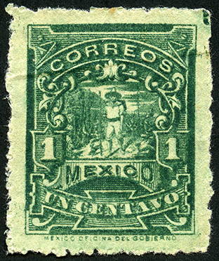 Para más información favor de dirigirse a biblioteca@mufi.org.mx No. Scott: 268a -- Año de Emisión: 1896-1897 -- Valor facial: Un Centavo -- Variedad de color: Verde -- Dentado: 12,6, 6X12, 12X6 -- Tipo de impresión: Grabado Timbre Postal Mexicano en color verde, en el se observa un paisaje rodeado de arbustos y a una persona que al parecer es un mensajero, el cual viste ropa de manta y sombrero, en la parte superior aparace la palabra "CORREOS", en la parte inferior "MEXICO" y el valor facial de "UN CENTAVO", del lado izquierdo y derecho se indica el valor con número. Es importante mencionar que este timbre pertenece a la serie conocida como "Mulitas" y que se puede encontrar información variada entre catálogos filatélicos.