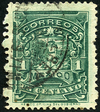 Para más información favor de dirigirse a biblioteca@mufi.org.mx No. Scott: 293-- Año de Emisión: 1898 -- Valor facial: Un Centavo -- Variedad de color: Verde -- Dentado: 12,6, 6X12, 12X6 -- Tipo de impresión: Grabado Timbre Postal Mexicano en color verde, en el se observa un paisaje rodeado de arbustos y a una persona que al parecer es un mensajero, el cual viste ropa de manta y sombrero, en la parte superior aparace la palabra "CORREOS", en la parte inferior "MEXICO" y el valor facial de "UN CENTAVO", del lado izquierdo y derecho se indica el valor con número, también se aprecia sobre la imagen un sello de cancelación en color negro. Es importante mencionar que este timbre pertenece a la serie conocida como "Mulitas"