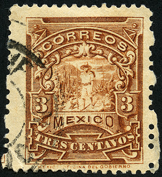 Timbre Postal Mexicano en color café castaño, en el se observa un paisaje rodeado de arbustos y a una persona que al parecer es un mensajero, el cual viste ropa de manta y sombrero, en la parte superior aparace la palabra "CORREOS", en la parte inferior "MEXICO" y el valor facial de "TRES CENTAVOS", del lado izquierdo y derecho se indica el valor con número, también se aprecia sobre la imagen un sello de cancelación en color negro. Es importante mencionar que este timbre pertenece a la serie conocida como "Mulitas" y que se puede encontrar información variada entre catálogos filatélicos.