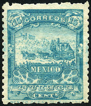 Timbre Postal Mexicano en color azul turquesa, en él se observa un paisaje rodeado de vegetación, en el centro de la imagen hay tres personas sentadas arriba de un carruaje y frente a este cuatro animales, al parecer son mulas o caballos, en la parte superior aparece el valor facial con número y la palabra "CORREOS", en la parte inferior "MEXICO " y "QUINCE CENTAVOS". Es importante mencionar que este timbre pertenece a la serie conocida como "Mulitas" y que se puede encontrar información variada entre catálogos filatélicos.