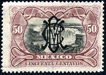 Para más información favor de dirigirse a biblioteca@mufi.org.mx No. Scott: 446 -- Año de Emisión: 1915 [1914] -- Valor facial: Cincuenta Centavos -- Variedad de color: Lila Rosáceo y Negro -- Dentado: 14, 14 1/2 -- Tipo de impresión: Grabado Timbre Postal Mexicano en colores lila rosáceo y negro, en la parte central se observa una imagen de las Cascadas de Juanacatlán , en la parte superior aparece la palabra "CORREOS" del lado izquierdo y derecho el valor facial con número y en la parte inferior "MEXICO" y "CINCUENTA CENTAVOS", sobre la imagen aparece una sobremarca en color negro.