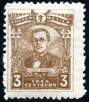 Para más información favor de dirigirse a biblioteca@mufi.org.mx No. Scott: 508-- Año de Emisión: 1915 -- Valor facial: Tres Centavos -- Variedad de color: Café -- Dentado: 12 -- Tipo de impresión: Grabado Timbre Postal Mexicano en color café, en él se observa la imagen de Ignacio Zaragoza, la cual se centra en un círculo ornamentado, en la parte superior está escrito "CORREOS" "MEXICO" y en la parte inferior el valor facial de "TRES CENTAVOS" con letra y número.