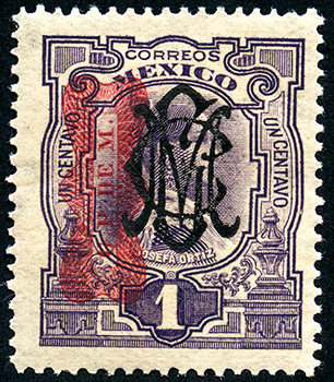 Timbre Postal Mexicano en color violeta, en él se observa la imagen de Josefa Ortíz de Dominguez, la cual se centra en un marco ornamentado, en la parte superior aparece escrito "CORREOS", "MEXICO", en la parte inferior el valor facial con número y en los lados izquierdo y derecho "UN CENTAVO", también se aprecia un resello en color rojo con las iniciales G. P. DE M. (GOBIERNO PROVISIONAL DE MÉXICO) y una sobremarca en color negro.