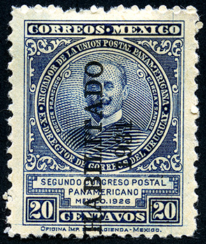 Timbre Postal Mexicano en color azul oscuro, en él se observa al Dr. Francisco García y Santos, fundador de la Unión Postal Panamericana, el cual se centra en un marco ornamentado, en la parte superior está escrito "CORREOS-MÉXICO" y en la parte inferior "SEGUNDO CONGRESO POSTAL PANAMERICANO, MÉXICO 1926" y el valor facial de "20 CENTAVOS", en la imagen también se aprecia una sobremarca en color negro.