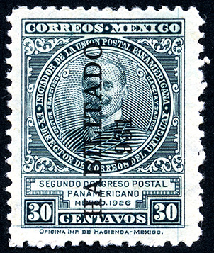Timbre Postal Mexicano en color verde oscuro, en él se observa al Dr. Francisco García y Santos, fundador de la Unión Postal Panamericana, el cual se centra en un marco ornamentado, en la parte superior está escrito "CORREOS-MÉXICO" y en la parte inferior "SEGUNDO CONGRESO POSTAL PANAMERICANO, MÉXICO 1926" y el valor facial de "30 CENTAVOS", en la imagen también se aprecia una sobremarca en color negro.
