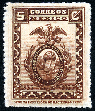 Emblema de la Sociedad Mexicana de Geografía y Estadística -- Con marca de Agua: CORREOS MEXICO (XI) -- Litografiado -- Ruleteado -- Cinco Centavos -- Café
