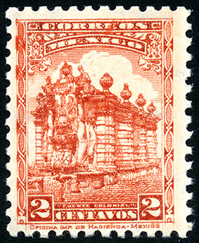 Para más información favor de dirigirse a biblioteca@mufi.org.mx No. Scott: 688 -- Año de Emisión: 1934 -- Valor facial: Dos Centavos -- Variedad de color: Rojo Escarlata -- Perforación: 10 1/2 y 11 -- Tipo de impresión: Grabado Timbre Postal Mexicano en color rojo escarlata, en él se observa la fuente Salto de Agua, monumento histórico perteneciente al Estado de México, el cual se centra en un marco ornamentado, en la parte superior aparece escrito "CORREOS" " MEXICO" y en la parte inferior el valor facial de " 2 CENTAVOS " con letra y número.