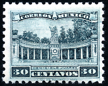 Para más información favor de dirigirse a biblioteca@mufi.org.mx No. Scott: 692 -- Año de Emisión: 1934 -- Valor facial: Treinta Centavos -- Variedad de color: Verde Oscuro -- Perforación: 10 1/2 y 11 -- Tipo de impresión: Grabado Timbre Postal Mexicano en color verde oscuro, en él se observa un Hemiciclo a Juárez, edificio histórico perteneciente al Estado de México, el cual se centra en un marco ornamentado, en la parte superior aparece escrito "CORREOS", "MÉXICO" y en la parte inferior "CENTAVOS" y el valor facial con número.
