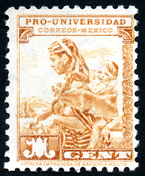 Para más información favor de dirigirse a biblioteca@mufi.org.mx No. Scott: RA13B -- Año de Emisión: 1934 -- Valor facial: Un Centavo -- Variedad de color: Naranja -- Perforación: 10 1/2 -- Tipo de impresión: Grabado Timbre Postal Mexicano en color naranja, en él se observan a una mujer y a un niño, ella va cargando al niño en la espalda, en las manos lleva algo pero no se distingue que és, esta imagen se centra en un marco ornamentado, en la parte superior aparece escrito "PRO-UNIVERSIDAD", "CORREOS MÉXICO" y en la parte inferior el valor facial de "1 CENTAVO".