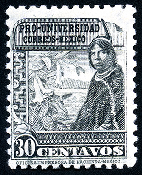 Para más información favor de dirigirse a biblioteca@mufi.org.mx No. Scott: 701 -- Año de Emisión: 1934 -- Valor facial: Treinta Centavos -- Variedad de color: Negro -- Perforación: 10 1/2 -- Tipo de impresión: Grabado Timbre Postal Mexicano en color negro, en él se observa a una mujer indígena sentada viendo hacia el frente, la cual lleva puesto a mi parecer un quexquemetl y una pluma adornando su cabeza, al lado de ella se aprecian flores y al fondo montañas, esta imagen se centra en un cuadro ornamentado, en la parte de SUPERIOR está escrito "PRO-UNIVERSIDAD", "CORREOS MÉXICO" en la parte inferior el valor facial de "30 CENTAVOS".