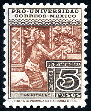 Para más información favor de dirigirse a biblioteca@mufi.org.mx No. Scott: 705 -- Año de Emisión: 1934 -- Valor facial: Cinco Pesos -- Variedad de color: Café, Rojo Oscuro -- Perforación: 10 1/2 -- Tipo de impresión: Grabado Timbre Postal Mexicano en colores café, rojizo y negro, en el se observa a una persona indígena incada del sexo femenino, semi desnuda, solo con una falda en forma de enredo, en la cabeza lleva un penacho con plumas y en las manos una ofrenda floral, en la parte superipor está escrito "PRO-UNIVERSIDAD", "CORREOS MÉXICO" y en la parte inferior el valor facial de "5 PESOS".