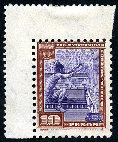 Para más información favor de dirigirse a biblioteca@mufi.org.mx No. Scott: 706 -- Año de Emisión: 1934 -- Valor facial: Diez Pesos -- Variedad de color: Café y violeta -- Perforación: 10 1/2 -- Tipo de impresión: Grabado Timbre Postal Mexicano en colores café y violeta, en el se observa a una persona indígena incada del sexo masculino, semi desnuda, solo con un taparrabo, en la cabeza lleva un penacho con plumas y en las manos un animal, no se distingue con exactitud que es, en la parte superior está escrito "PRO-UNIVERSIDAD", en el lado lateral derecho "CORREOS MEXICO" y en la parte inferior el valor facial de "10 PESOS".