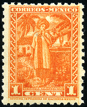 Para más información favor de dirigirse a biblioteca@mufi.org.mx India Yalalteca -- Con marca de Agua: CORREOS MEXICO (XI) -- Litografiado -- Con Perforación -- Un Centavo -- Naranja Timbre Postal Mexicano en color naranja, en el se observa a una mujer indígena, ella está de pie, lleva puesto un huipil y una falda, en la cabeza porta un rodete y en la espalda va cargando un cántaro, en la parte superior de la imagen está escrito "CORREOS MEXICO" y en la parte inferior el valor facial de "1 CENTAVO". No. Scott: 707 -- Año de Emisión: 1934-1940 -- Valor facial: Un Centavo -- Variedad de color: Naranja -- Perforación: 10 1/2 -- Tipo de impresión: Grabado