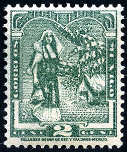 Para más información favor de dirigirse a biblioteca@mufi.org.mx No. Scott: 708 -- Año de Emisión: 1934-1940 -- Valor facial: Dos Centavos -- Variedad de color: Verde Oscuro -- Perforación: 10 1/2 -- Tipo de impresión: Grabado Timbre Postal Mexicano en color verde oscuro, en el se observa a una mujer que está de pie, lleva puesto un huipil y una falda con encaje, se aprecian dos trenzas y un resplandor en la cabeza, va cargando algo con la mano izquierda pero no se distingue que és, en los lados izquierdo y derecho está escrito "CORREOS MÉXICO" y en la parte inferior el valor facial de "2 CENTAVOS".