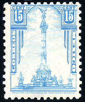 Monumento a la Independencia, Estado de México -- Con marca de Agua: CORREOS MEXICO (XI) -- Litografiado -- Con Perforación -- Quince Centavos -- Azul Claro