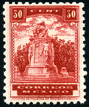 Para más información favor de dirigirse a biblioteca@mufi.org.mx No. Scott: 716 -- Año de Emisión: 1934-1940 -- Valor facial: Treinta Centavos -- Variedad de color: Rojo -- Perforación: 10 1/2 -- Tipo de impresión: Grabado Timbre Postal Mexicano en color rojo, en él se observa un Monumento a los Niños Héroes, escultura histórica perteneciente al Estado de México, esta imagen se centra en un marco ornamentado, en la parte superior aparece escrito el valor facial de "30 CENTAVOS" y en la parte inferior "CORREOS MEXICO" .