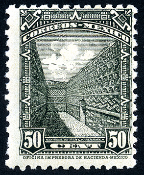 Para más información favor de dirigirse a biblioteca@mufi.org.mx No. Scott: 718 -- Año de Emisión: 1934-1940 -- Valor facial: Cincuenta Centavos -- Variedad de color: Verde Oscuro -- Perforación: 10 1/2 -- Tipo de impresión: Grabado Timbre Postal Mexicano en color verde oscuro, en él se observa la zona arqueológica de Mitla, perteneciente al estado de Oaxaca, esta imagen se centra en un marco ornamentado, en la parte superior aparece escrito "CORREOS MEXICO" y en la parte inferior el valor facial de "50 CENTAVOS" .