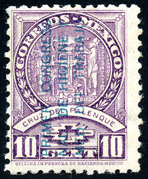 Para más información favor de dirigirse a biblioteca@mufi.org.mx No. Scott: 728 -- Año de Emisión: 1937 -- Valor facial: Diez Centavos -- Variedad de color: Violeta -- Perforación: 10 1/2 -- Tipo de impresión: Grabado Timbre Postal Mexicano en color violeta, en él se observa el Monumento de Cruz de Palenque, escultura histórica perteneciente al Estado de Chiapas, esta imagen se centra en un marco ornamentado, en la parte superior aparecen escrito"CORREOS-MEXICO" y en la parte inferior "CRUZ DE PALENQUE" y el valor facial de "10 CENTAVOS", sobre la imagen también se aprecia una sobremarca en color verde.