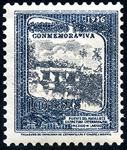 Para más información favor de dirigirse a biblioteca@mufi.org.mx No. Scott: 726 -- Año de Emisión: 1936 -- Valor facial: Diez Centavos -- Variedad de color: Pizarra Negro -- Perforación: 14 -- Tipo de impresión: Grabado Timbre Postal Mexicano en colores pizarra y negro, en el se observa la imagen del puente de Matalote, el cual se centra en un cuadro ornamentado, en la parte superior aparece escrito "CORREOS MEXICO", "CONMEMORATIVA" y en la parte inferior el valor facial de "10 CENTAVOS".