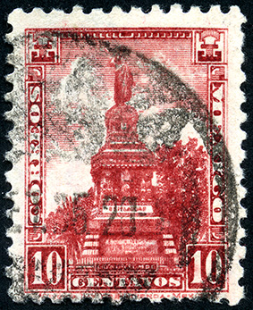 Para más información favor de dirigirse a biblioteca@mufi.org.mx No. Scott: 727 A-- Año de Emisión: 1936 -- Valor facial: Diez Centavos -- Variedad de color: Escarlata -- Perforación: 14 -- Tipo de impresión: Grabado Timbre Postal Mexicano en color escarlata, en el se observa un Monumento a Cuautémoc, escultura histórica perteneciente al Estado de México, el cual se centra en un marco ornamentado, en los lados izquierdo y derecho aparece escrito "CORREOS" " MEXICO" y en la parte inferior el valor facial de "10 CENTAVOS".