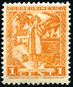 Para más información favor de dirigirse a biblioteca@mufi.org.mx No. Scott: 729-- Año de Emisión: 1936 -- Valor facial: Un Centavo -- Variedad de color: Naranja -- Perforación: 14 -- Tipo de impresión: Grabado Timbre Postal Mexicano en color naranja, en el se observa a una mujer indígena, ella está de pie, lleva puesto un huipil y una falda, en la cabeza porta un rodete y en la espalda va cargando un cántaro, en la parte superior de la imagen está escrito "CORREOS MEXICO" y en la parte inferior el valor facial de "1 CENTAVO".