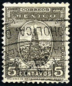Para más información favor de dirigirse a biblioteca@mufi.org.mx No. Scott: 733B -- Año de Emisión: 1937 -- Valor facial: Cinco Centavos -- Variedad de color: Café Olivo -- Perforación: 14 -- Tipo de impresión: Grabado Timbre Postal Mexicano en color café olivo, en él se observa la Torre de los Remedios, escultura histórica perteneciente al Estado de México, esta imagen se centra en un óvalo ornamentado, en la parte superior aparecen escrito"CORREOS", "MEXICO" y en la parte inferior el valor facial DE "5 CENTAVOS".
