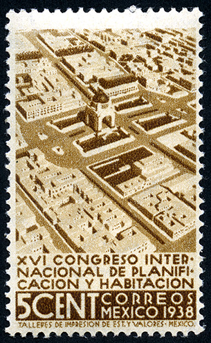 Para más información favor de dirigirse a biblioteca@mufi.org.mx No. Scott: 740 -- Año de Emisión: 1938 -- Valor facial: Cinco Centavos -- Variedad de color: Amarillo Pardo -- Perforación: 14 -- Tipo de impresión: Grabado Timbre Postal Mexicano en color amarillo pardo, en él se observa una vista aérea del Monumento a la Revolución Mexicana, escultura histórica perteneciente al Estado de México, en la parte inferiror aparece escrito "XVI CONGRESO INTERNACIONAL DE PLANIFICACION Y HABITACION", valor facial de "5 CENT" y "CORREOS MEXICO 1938"