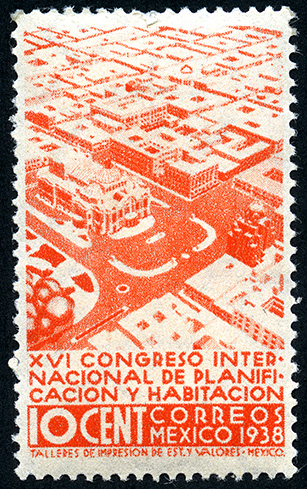 Para más información favor de dirigirse a biblioteca@mufi.org.mx No. Scott: 742 -- Año de Emisión: 1938 -- Valor facial: Diez Centavos -- Variedad de color: Naranja -- Perforación: 14 -- Tipo de impresión: Grabado Timbre Postal Mexicano en color naranja, en él se observa una vista aérea del Palacio de las Bellas Artes, edificio histórico perteneciente al Estado de México, en la parte inferiror aparece escrito "XVI CONGRESO INTERNACIONAL DE PLANIFICACION Y HABITACION", valor facial de "10 CENT" y "CORREOS MEXICO 1938"