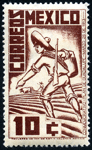 Para más información favor de dirigirse a biblioteca@mufi.org.mx No. Scott: 738 -- Año de Emisión: 1938 -- Valor facial: Diez Centavos -- Variedad de color: Café Rojizo -- Perforación: 14 -- Tipo de impresión: Grabado Timbre Postal Mexicano en color café rojizo, en él se observa a un campesino quien va sembrando la tierra, al fondo de la imagen se aprecian dos toros y otra persona, en la parte superior aparece escrito "CORREOS MEXICO", a un costado del lado derecho "CONMEMORATIVO PLAN DE GUADALUPE-MARZO 26 DE 1913" y en la parte inferior el valor facial de "DIEZ CENTAVOS"