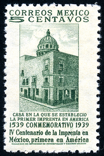 Para más información favor de dirigirse a biblioteca@mufi.org.mx No. Scott: 749 -- Año de Emisión: 1939 -- Valor facial: Cinco Centavos -- Variedad de color: Verde -- Perforación: 10 1/2 -- Tipo de impresión: Grabado Timbre Postal Mexicano en color verde, en él se oberva la casa en donde se estableció la primera imprenta de América, en la parte superior aparece escrito "CORREOS MEXICO" y el valor facial de "5 CENTAVOS" y en la parte inferior "IV CENTENARIO DE LA IMPRENTA EN MEXICO, PRIMERA EN AMERICA".