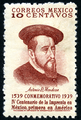 Para más información favor de dirigirse a biblioteca@mufi.org.mx No. Scott: 750 -- Año de Emisión: 1939 -- Valor facial: Diez Centavos -- Variedad de color: Café Rojizo -- Perforación: 10 1/2 -- Tipo de impresión: Grabado Timbre Postal Mexicano en color café rojizo, en él se observa al militar español Antonio de Mendoza, en la parte superior aparece escrito "CORREOS MEXICO" y el valor facial de "10 CENTAVOS" y en la parte inferior "IV CENTENARIO DE LA IMPRENTA EN MEXICO, PRIMERA EN AMERICA".