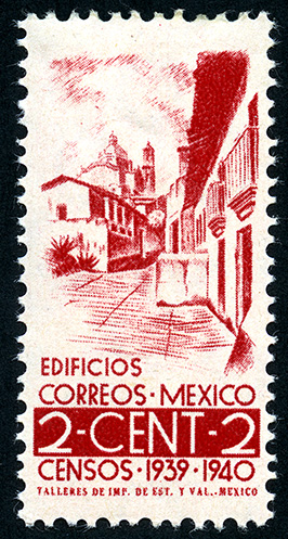 Levatamienrto de los Censos Nacionales (Edificios) -- Con marca de Agua: CORREOS MEXICO ( XI ) -- Fotograbado -- Con Perforación -- Dos Centavos -- Rojo Oscuro