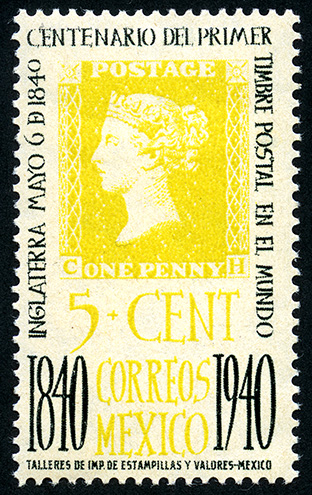 Timbre Postal Mexicano en colores negro y amarillo limón, en la imagen se observa el perfíl de la Reina Victoria de Inglaterra, en el contorno del timbre aparece escrito "INGLATERRA MAYO 6 DE 1840", "CENTENARIO DEL PRIMER TIMBRE POSTAL EN EL MUNDO", en la parte inferior el valor facial de "5 CENTAVOS" y "CORREOS MEXICO"