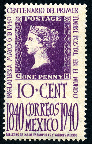 Para más información favor de dirigirse a biblioteca@mufi.org.mx No. Scott: 755 -- Año de Emisión: 1940 -- Valor facial: Diez Centavos -- Variedad de color: Violeta -- Perforación: 14 -- Tipo de impresión: Grabado Timbre Postal Mexicano en color violeta, en la imagen se observa el perfíl de la Reina Victoria de Inglaterra, en el contorno del timbre aparece escrito "INGLATERRA MAYO 6 DE 1840", "CENTENARIO DEL PRIMER TIMBRE POSTAL EN EL MUNDO", en la parte inferior el valor facial de "10 CENTAVOS" y "CORREOS MEXICO"